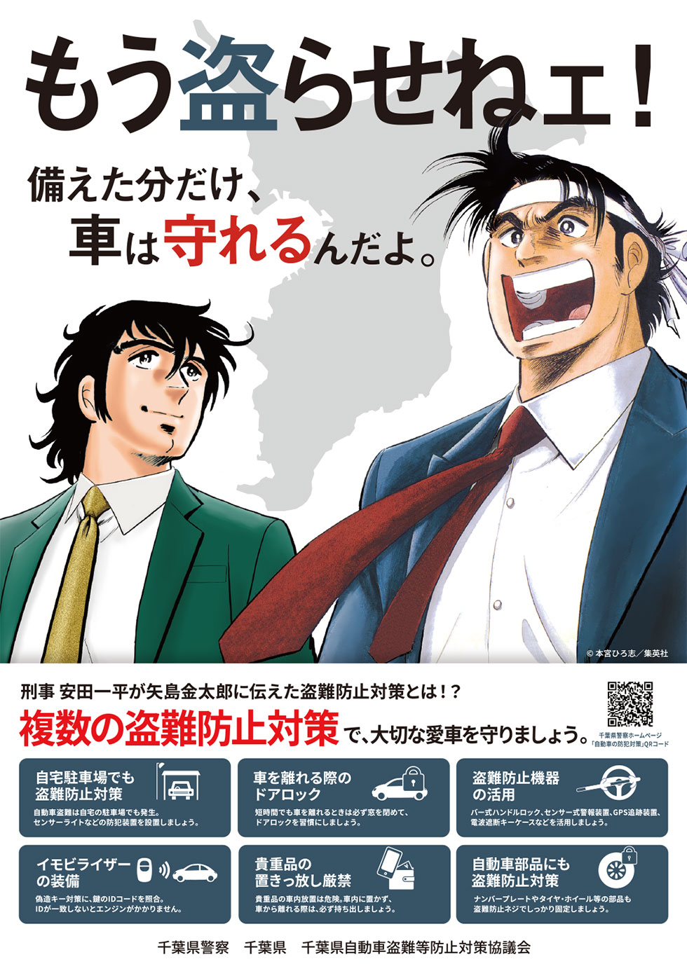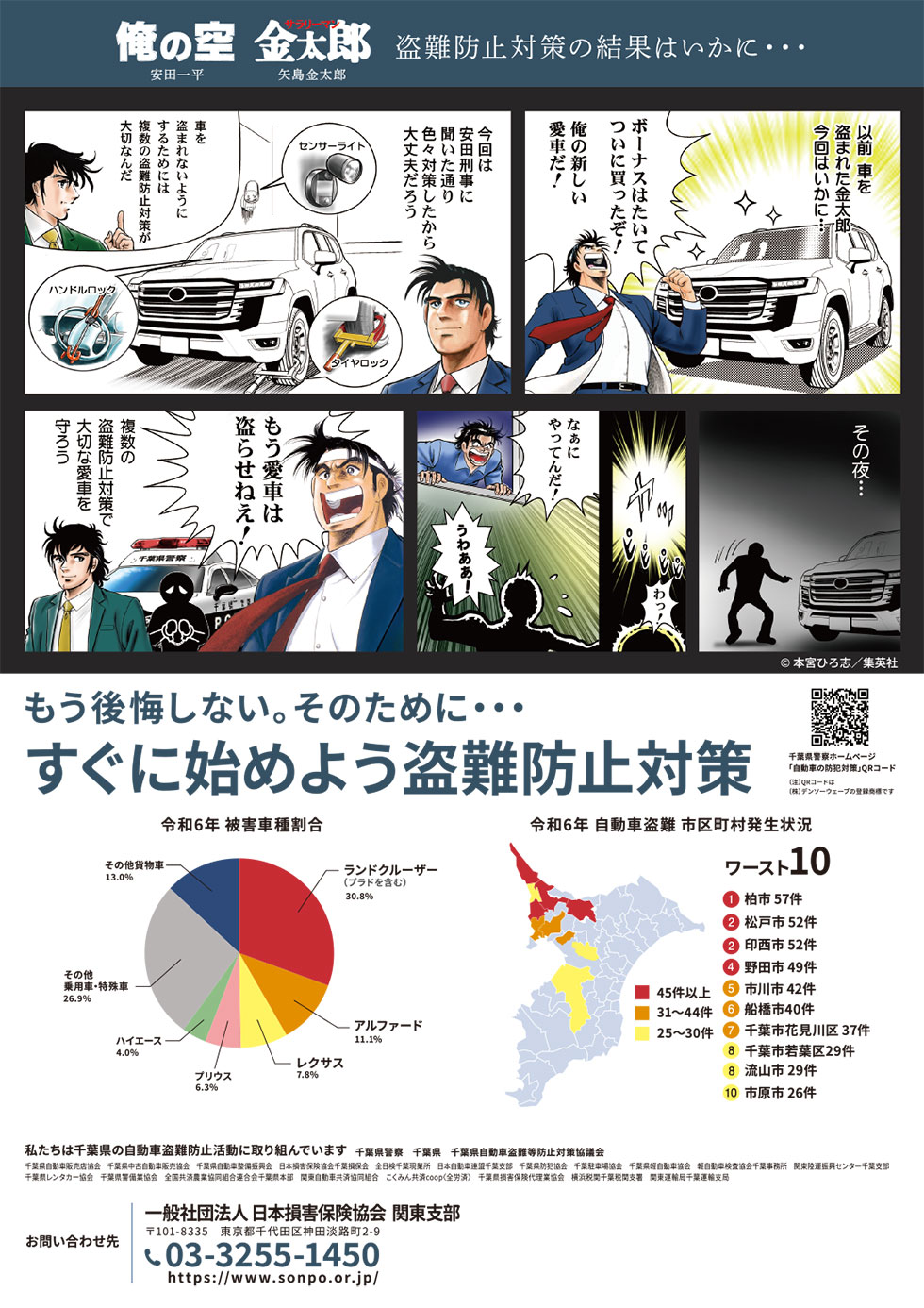千葉県自動車盗難等防止対策協議会(千葉県中古自動車販売協会が所属)では、自動車盗難防止の啓発活動を行っています。 千葉県警察・千葉県・千葉県自動車盗難等防止対策協議会の連名で自動車盗難防止を啓発するチラシが作成されました。 千葉県出身の漫画家・本宮ひろ志さんにご協力いただき、先生の作品「サラリーマン金太郎」「俺の空」とコラボしたチラシです。 お客様への自動車盗難啓発にご活用ください。 » 詳細PDFはコチラ
